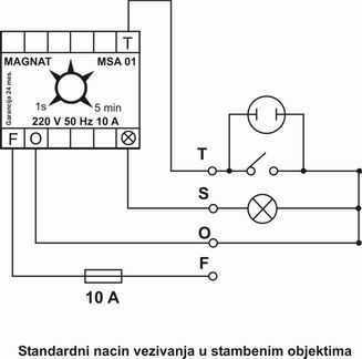 Uredjaj je projektovan za napajanje stepenisnog osvetljenja u stambenim i poslovnim objektima gde se ogranicava vreme trajanja osvetljenja i upravlja pozivnim tasterom. Tasteri se napajaju naizmenicnom strujom ogranicenog dejstva sto omogucava da taster svetli u mraku. Nazivna struja kontakta iznosi 10 A a vreme trajanja intervala podesivo od 1 sec. do 5 min. Ugradjen autoreset za ponovno ukljucenje u slucaju zaglavljivanja tastera.